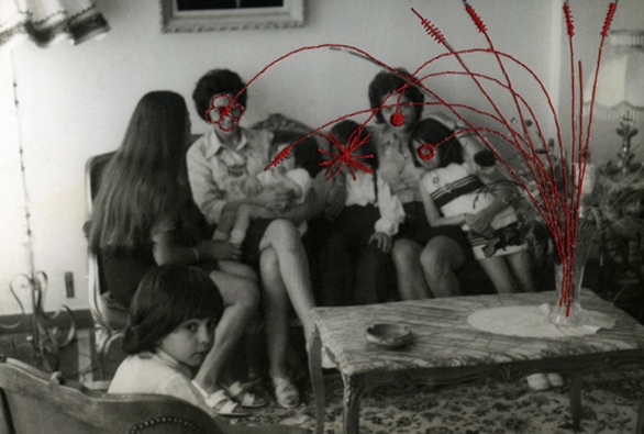 L’album de famille catalyse le souvenir et l’imaginaire sur lequel je couds, brode, colle et découpe, je joue avec le fil rouge des émotions et la fragilité des perles de verre laissant remonter quelques fois les ruines archaïques de mon histoire. Images du passé et intervention du présent, la réalité et le rêve sont les clefs de mon langage pictural.